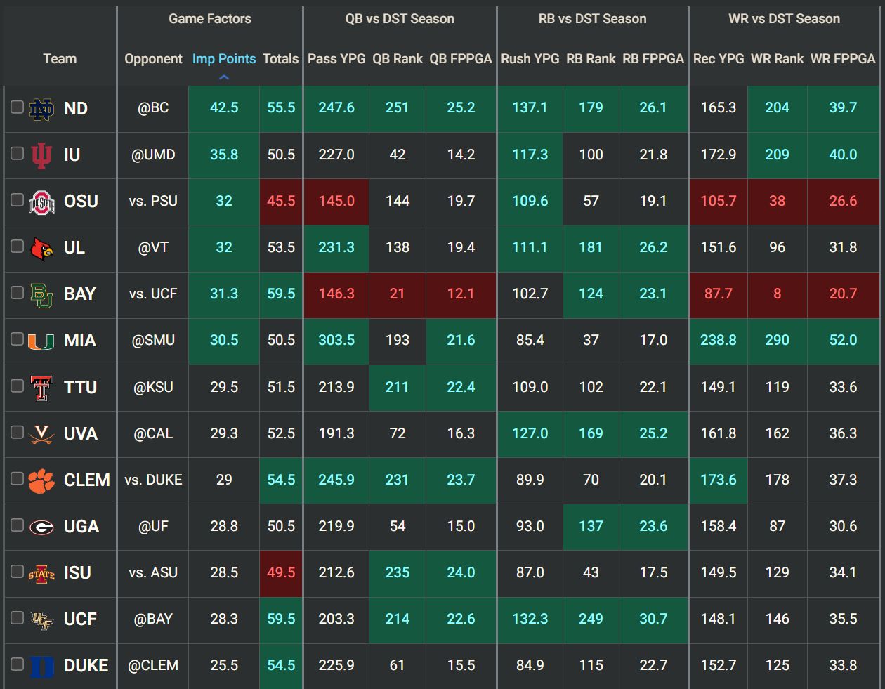 To begin, letās get a look at the 13 teams with a 25.5+ implied point total on this slate. These teams are generally in the best spot for offensive success this Saturday, so the majority of our preferred DFS plays will be found on these rosters: