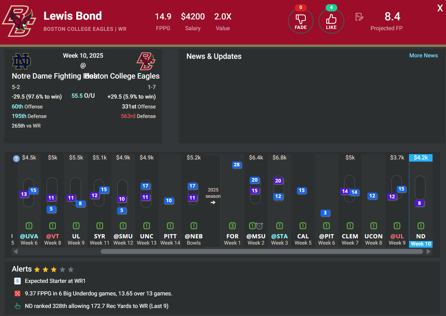 WR Lewis Bond, Boston College | $4,200 | vs. ND