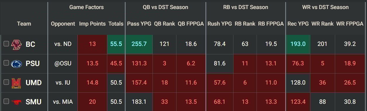 Boston College (13.0 implied points) is one of those offenses that we probably donāt want much to do with, but, in this case, weāre getting a high-volume receiver at a very cheap price point in a game that his team will almost certainly be playing from behind. Bondās 56 receptions (7.0 rec/gm) are the 5th-most among all FBS receivers. Heās had five separate games where he has seen double-digit targets. Itās also not as if Notre Dameās secondary has been lockdown. The 193.0 YPG that Notre Dame has allowed to WRs this season is the second-most on the slate. Bond is only averaging 9.6 yards per reception, and he has only found the endzone once this season, which came against Louisville in week nine. But, with DraftKings' full PPR scoring system, we donāt exactly need 100+ yards and a TD out of Bond to get some nice value out of him.