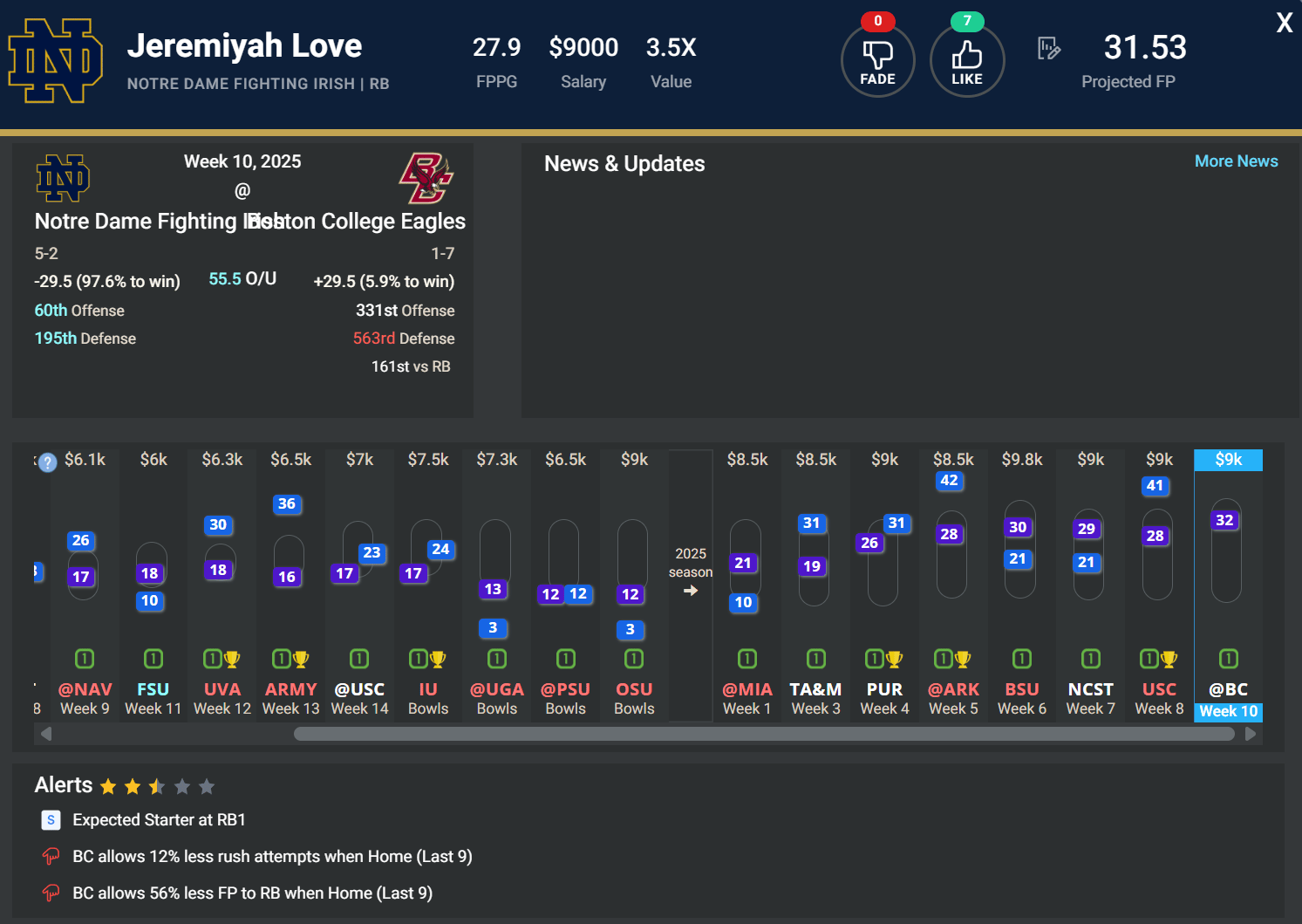 Weāll be saving salary at other positions this week, so Jeremiyah Love will step in as a primo spend-up. Love needs little introduction as one of the best offensive players in the country who will likely be the first RB off the board in next yearās NFL Draft. But he heads into the eighth game of the season averaging 136.4 scrimmage YPG on 20.4 touches/gm with 12 total TDs. Thereās a strong chance this game turns into a blowout as the Irish are near-30-point favorites. But Love should still have himself a big day before this game gets too out of hand. Boston College has allowed over seven yards per touch and 1.5 TDs/gm to RBs over their last four games.