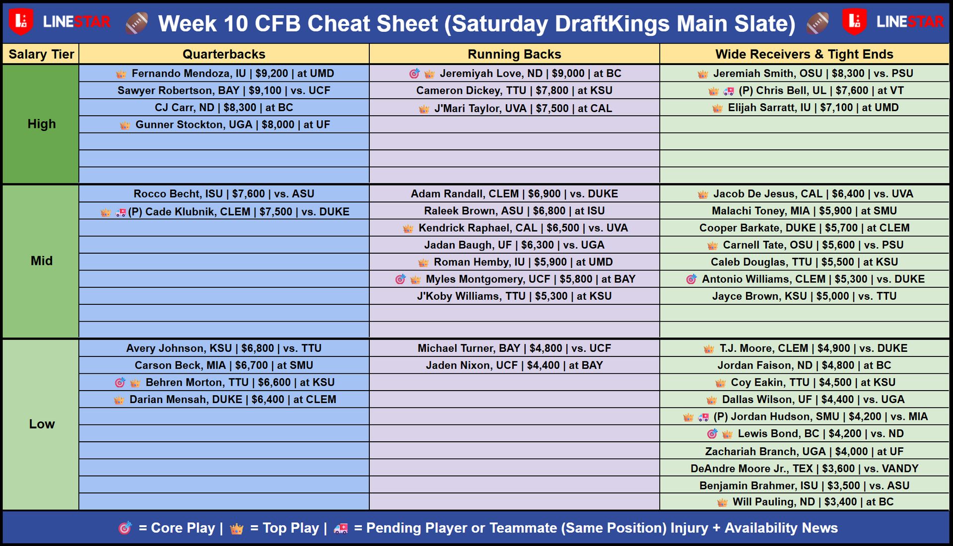 - DraftKings CFB Saturday Core Plays & Cheat Sheet: Week #10 | Navigating a Tricky Slate! š