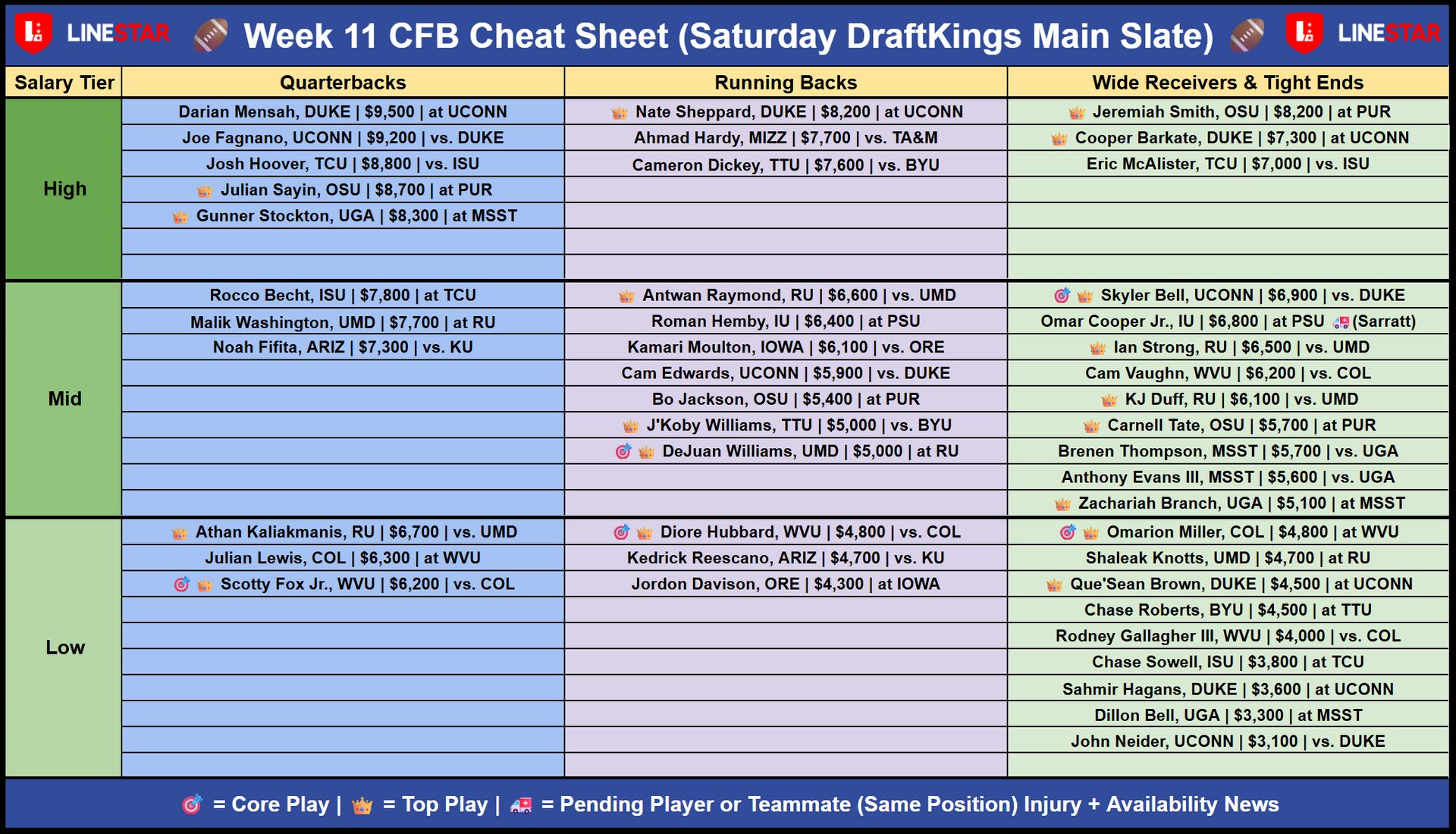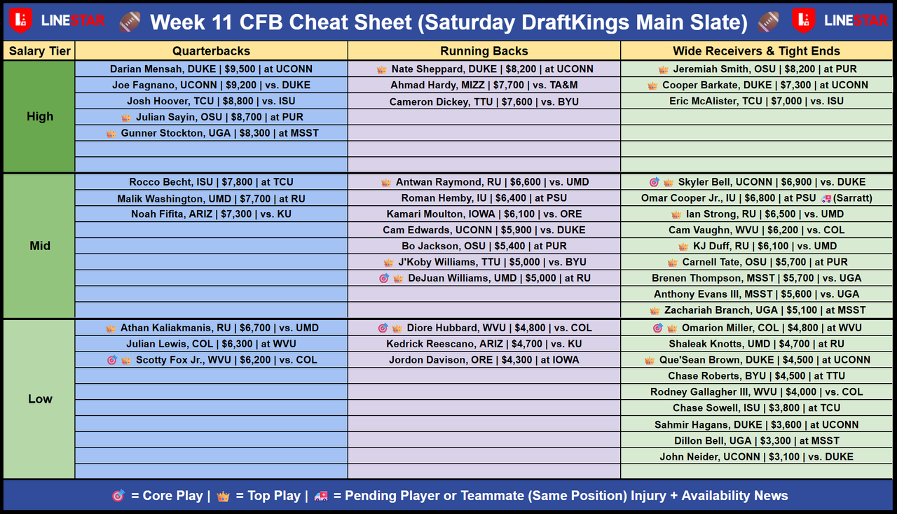 - DraftKings CFB Saturday Core Plays & Cheat Sheet: Week #11 | Running Down Another Pivotal CFB Slate! š