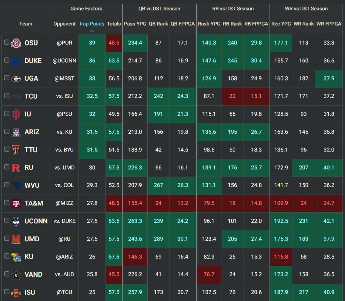 To begin, letās get a look at the 15 teams with a 25+ implied point total on this slate. These teams are generally in the best spot for offensive success this Saturday, so the majority of our preferred DFS plays will be found on these rosters: