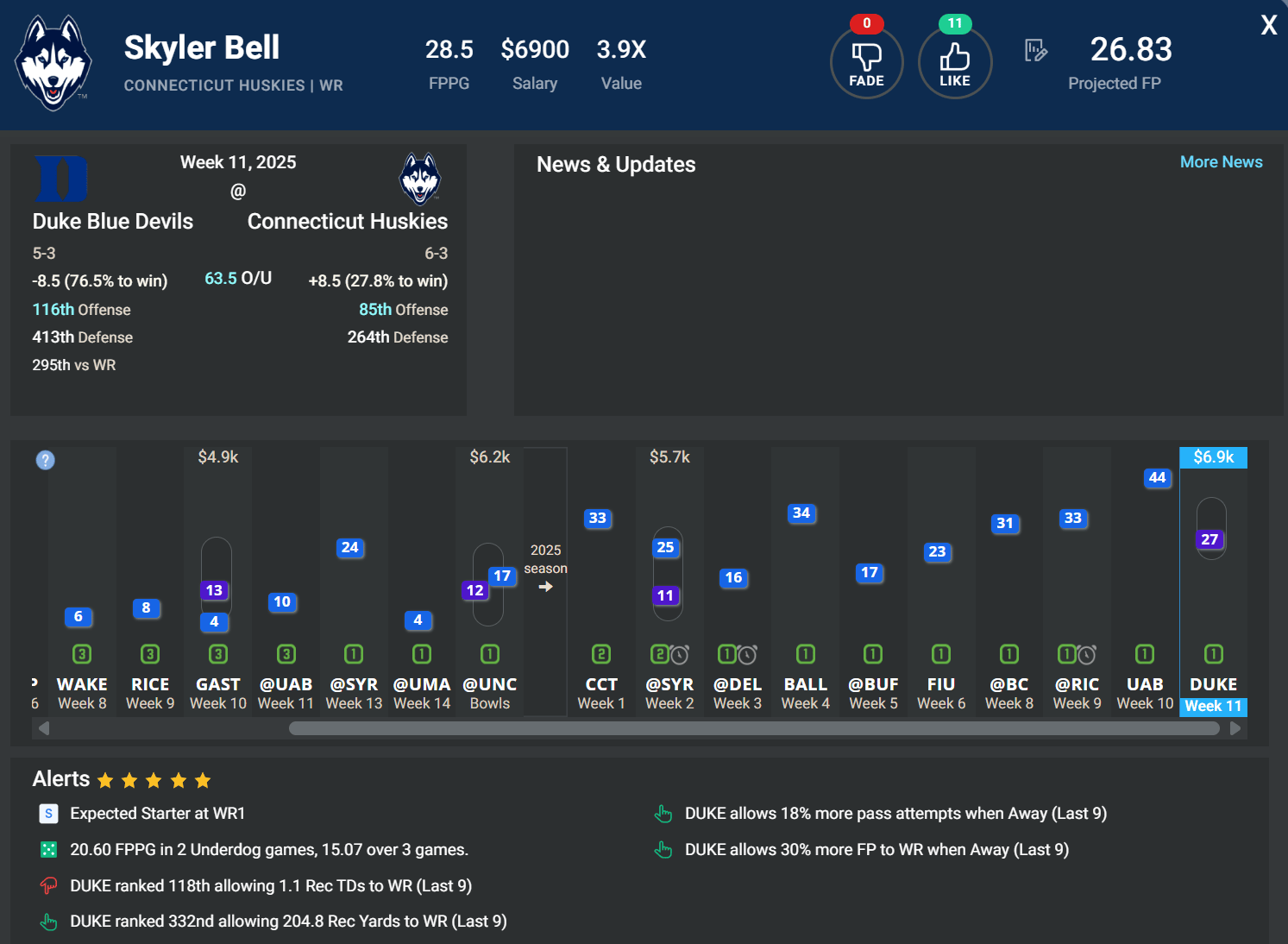 WR Skyler Bell, UCONN | $6,900 | vs. DUKE