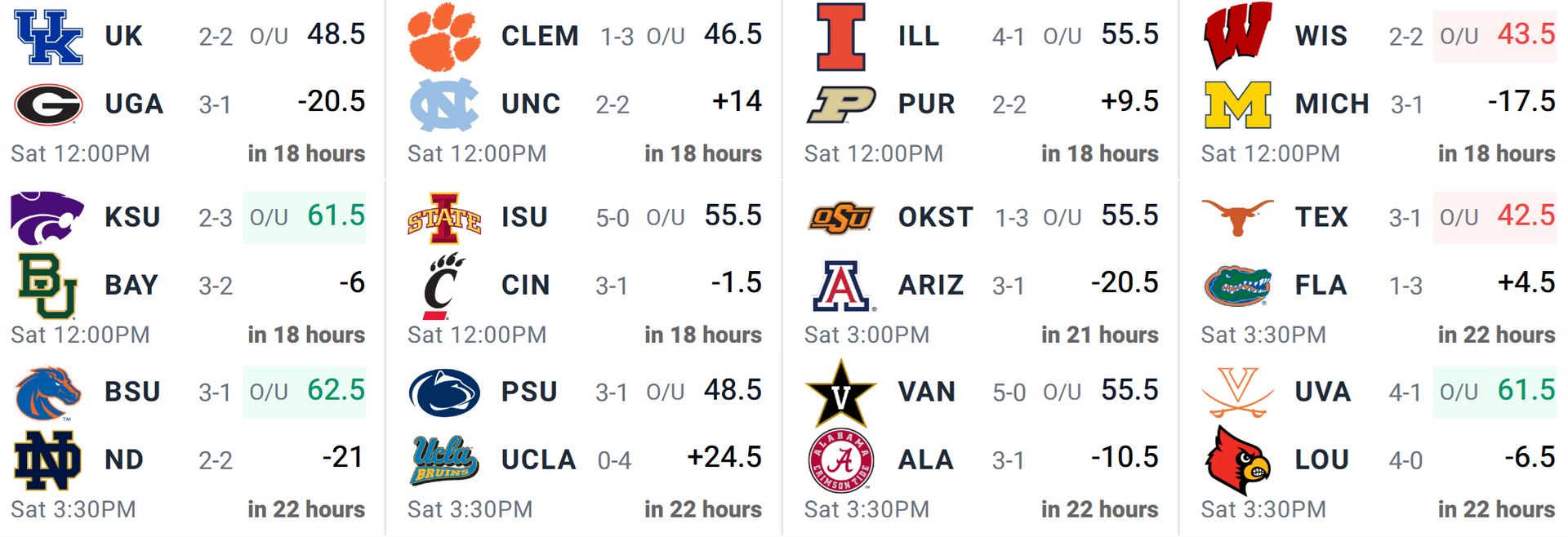 We are somehow already nearing the midway point of the CFB regular season with week six on the horizon! Last Saturday led to some seismic results and plenty of fallout from several marquee matchups. This week isnāt quite as loaded with premium matchups, but there are still plenty of pivotal games on tap.