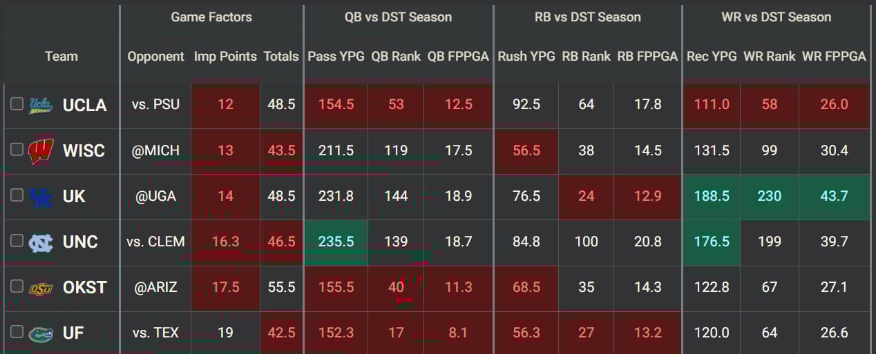 On the other hand, weāll want limited-to-no exposure to teams that are expected to struggle to score 20+ points. These teams generally either find themselves completely out-matched versus their upcoming opponent, they donāt possess a capable offense, their matchup is expected to be a slow and low-scoring affair, or itās some combination of those factors. Unless a specific player is priced down, has near-matchup-proof talent, and is guaranteed high volume, we should lean toward avoiding these six teams on the slate: