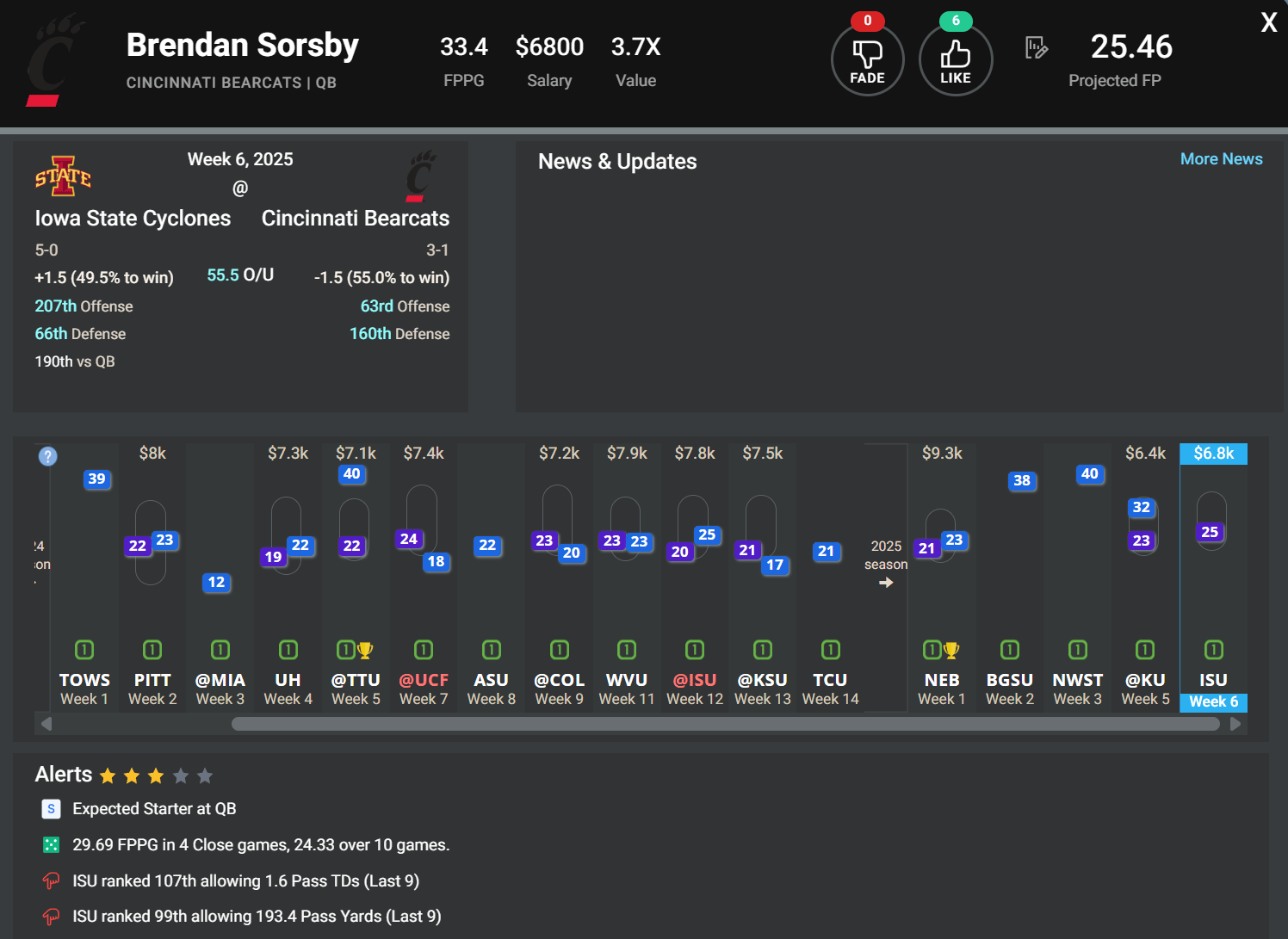 QB Brendan Sorsby, Cincinnati | $6,800 | vs. ISU