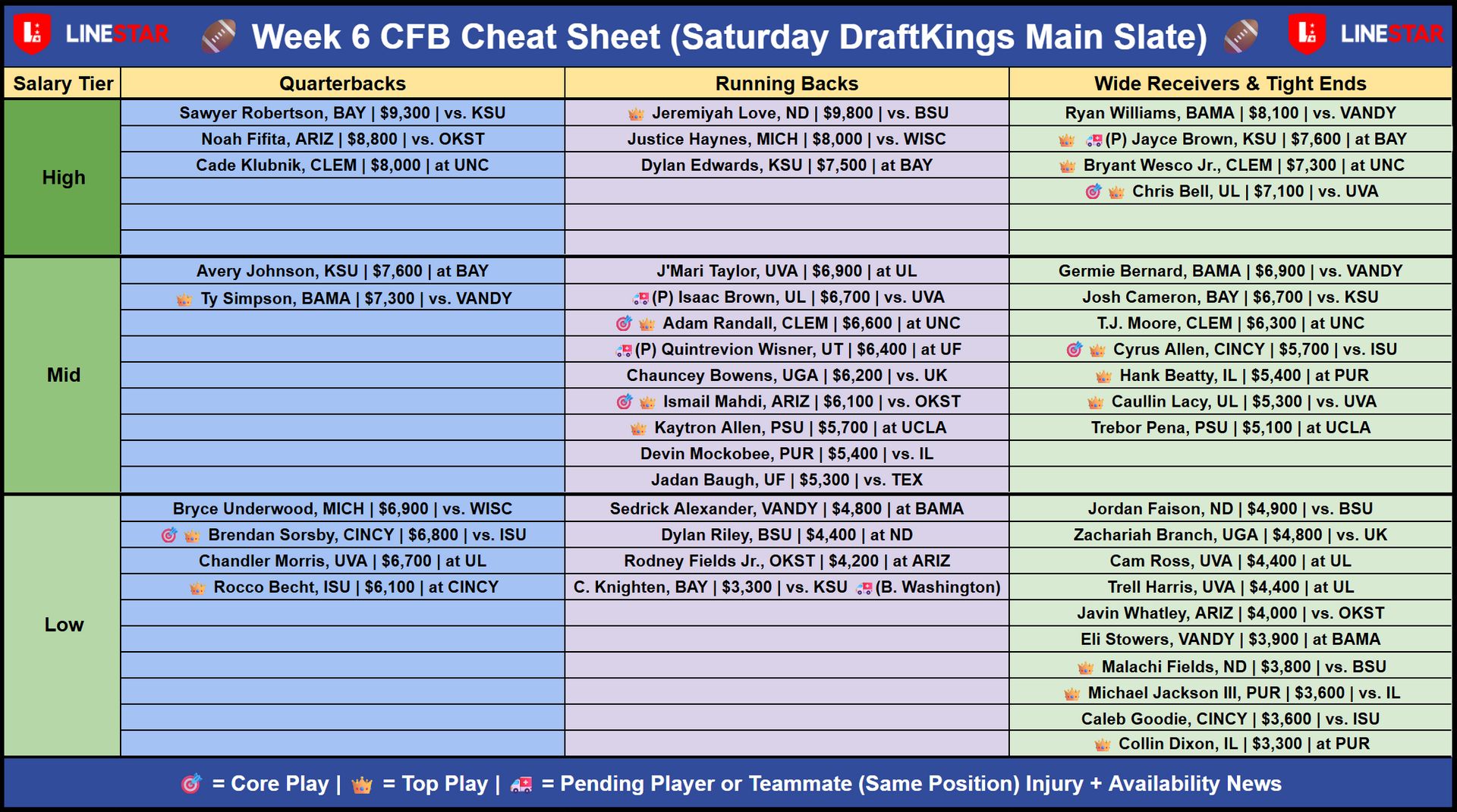 - DraftKings CFB Saturday Core Plays & Cheat Sheet: Week #6 | Flying Into the Midseason! š