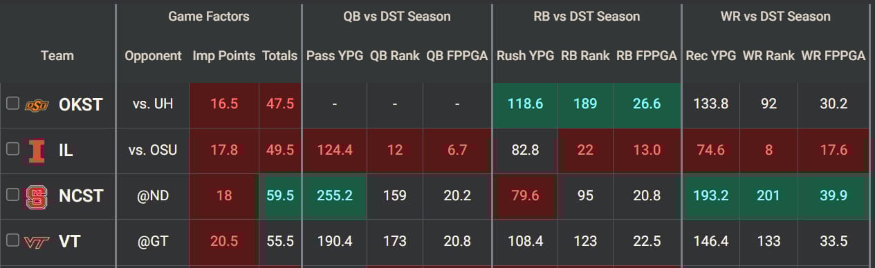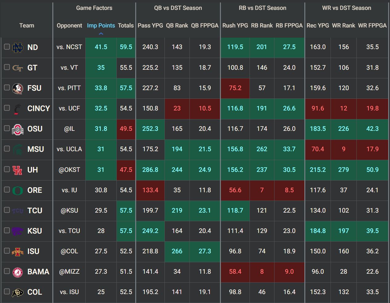 We hit the regular season midway point with week seven on the horizon! This will be another pivotal college football Saturday with a trio of top 25 matchups on tap (all of which are on the main slate). As usual, the focus of this newsletter will be on the DraftKings 12-game main slate, which will kick off at noon ET. FanDuel’s 14-game main slate differs slightly in structure. Still, with eight games overlapping, much of the analysis in this newsletter will apply to both sites (but be mindful of player salary discrepancies). Let’s dive in! Best of luck!