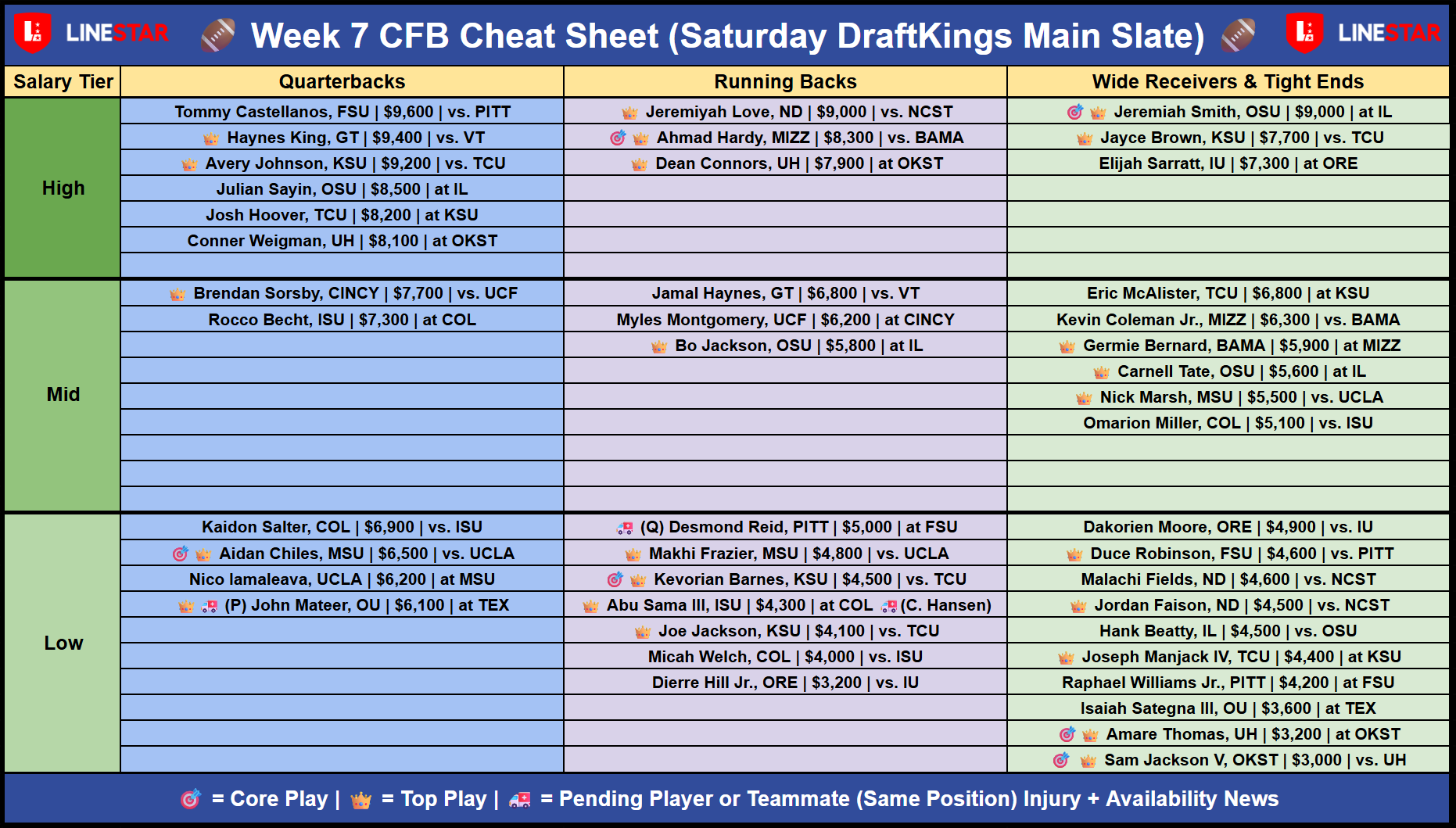 - DraftKings CFB Saturday Core Plays & Cheat Sheet: Week #7 | Running Down a Climactic Slate of Games! 🏈
