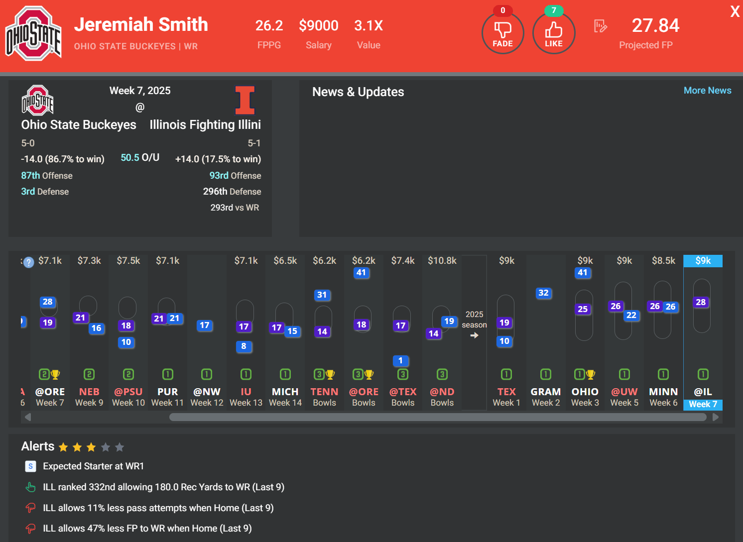 Nothing revolutionary here, as Jeremiah Smith is arguably the top WR in the country as a true sophomore and will probably be a top-five draft pick in the NFL draft in a couple of years. He had a quiet week one in the low-scoring 14-7 win versus Texas, but has since been tearing it up. Over the last four games, Smith has put up 7.3 receptions/gm for 105.0 YPG with seven TDs (three multi-TD games). His 32.4% Target% leads all receivers on this slate, and he’ll also draw an excellent matchup versus an Illinois defense that has allowed the second-most FPPG to WRs on the slate. This is a top 25 matchup, so while Ohio State (-14) is favored by a couple of TDs, there is reason to believe that Illinois can keep this game fairly close, which, in turn, would force the OSU offense to stay aggressive through the air. OSU QB Julian Sayin has also completed a slate-best 80.2% of his passes this season, so Smith has been seeing plenty of accurate targets.